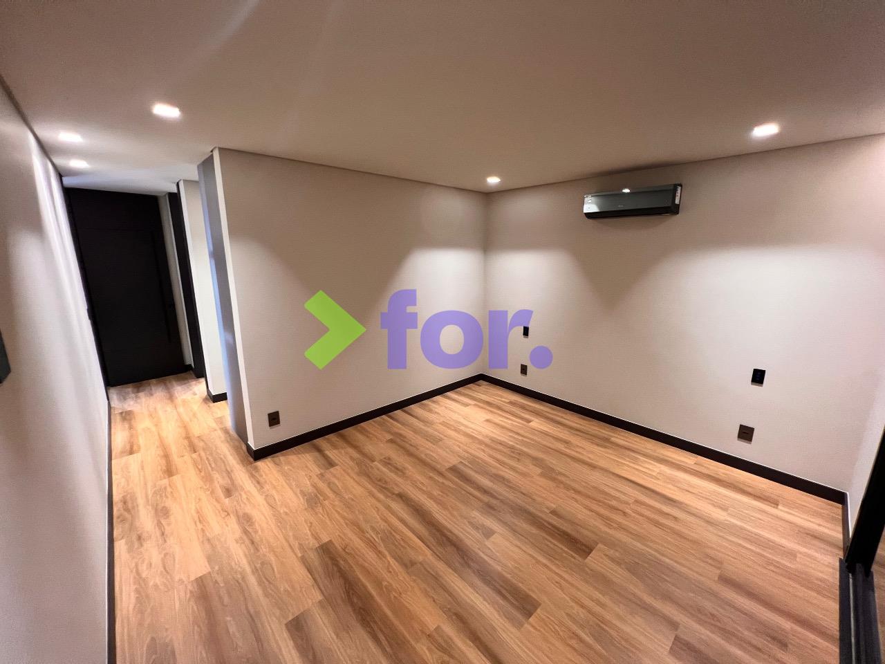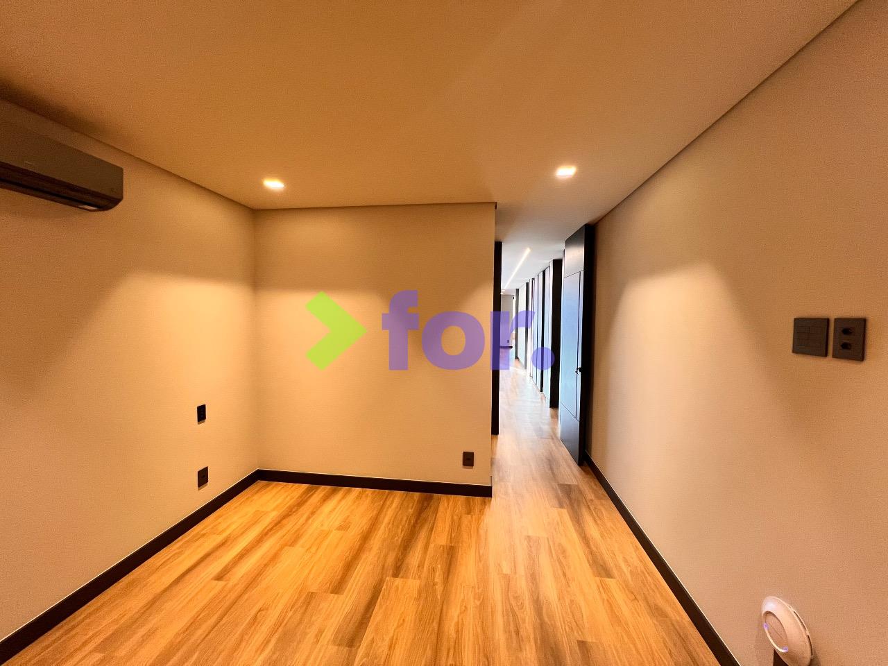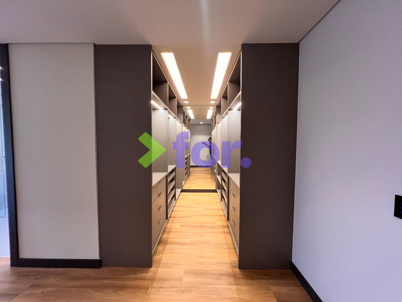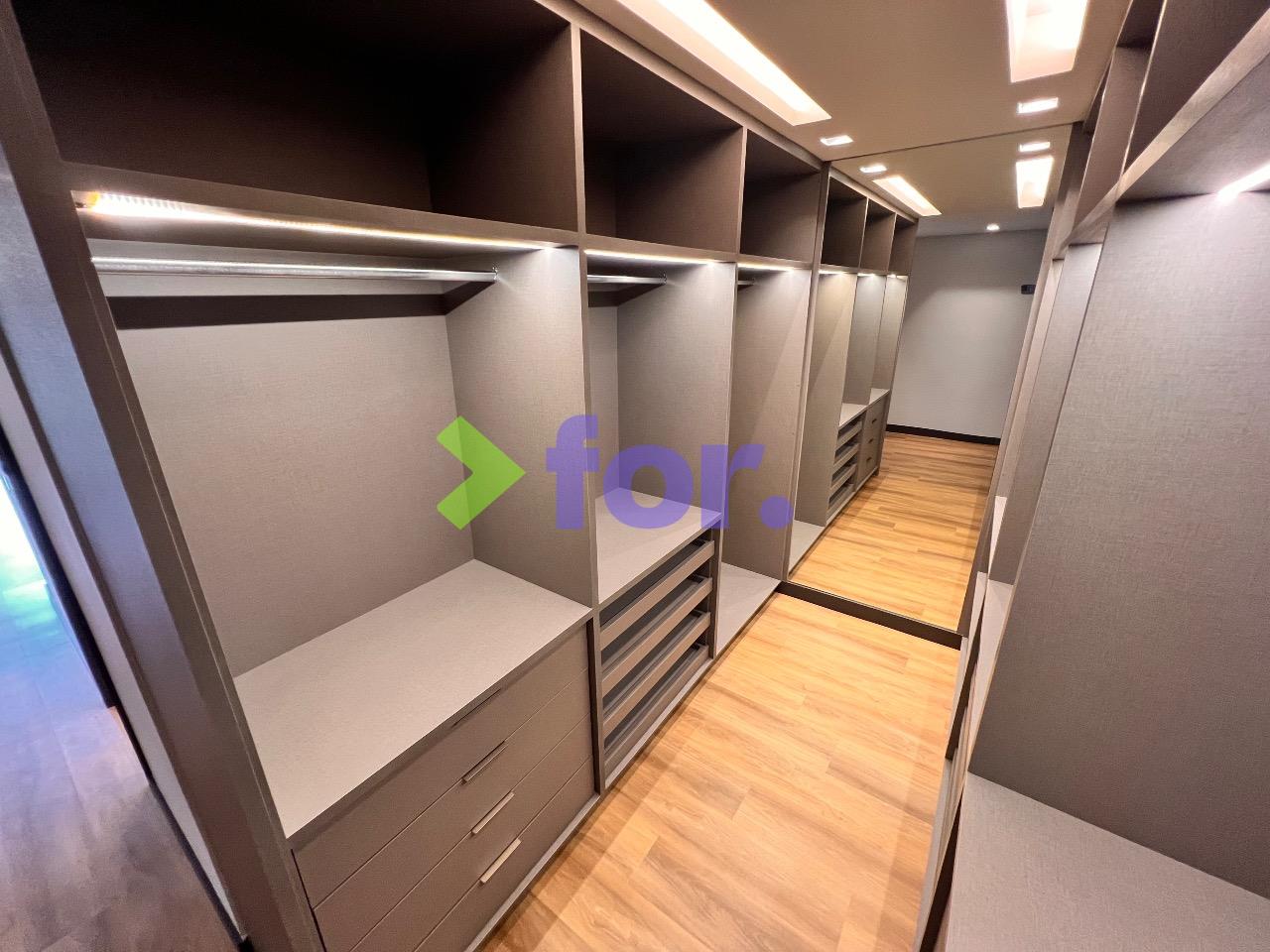 Quatro suítes, todas com closet e ar-condicionado. Rouparia no hall íntimo.