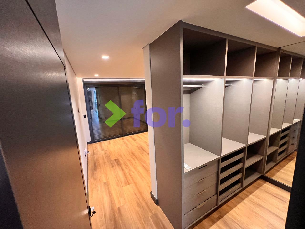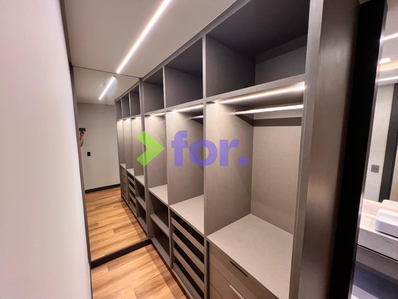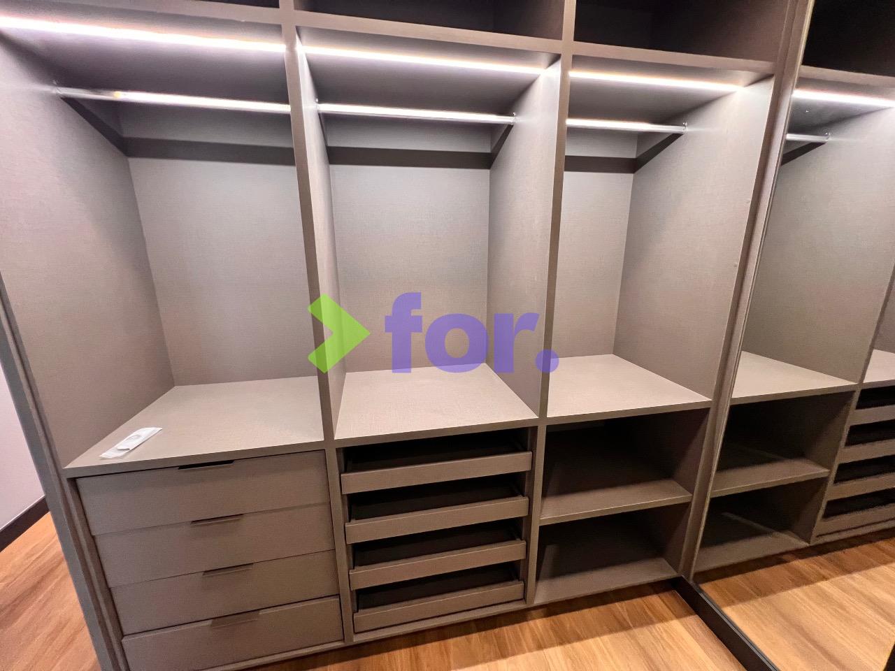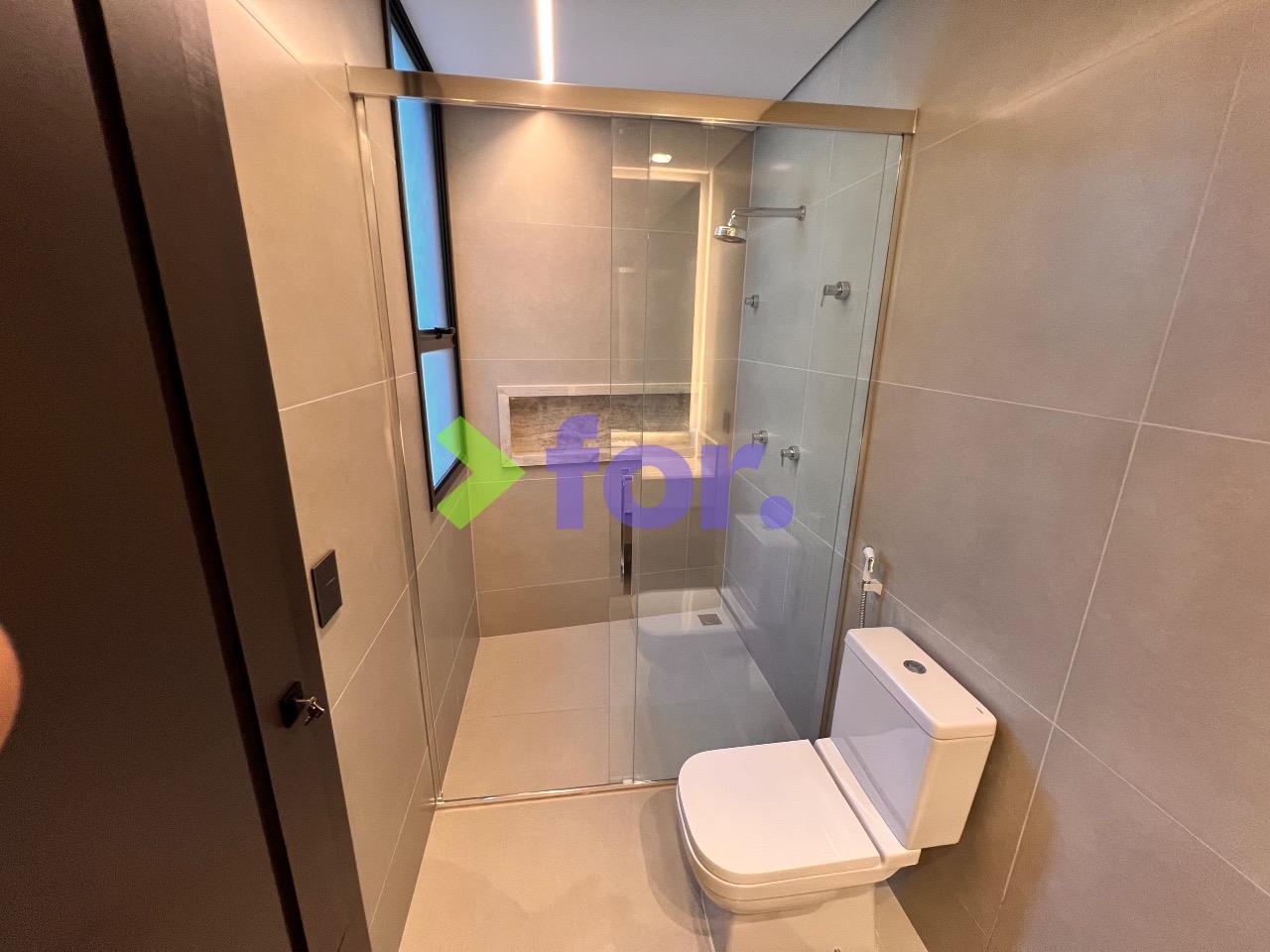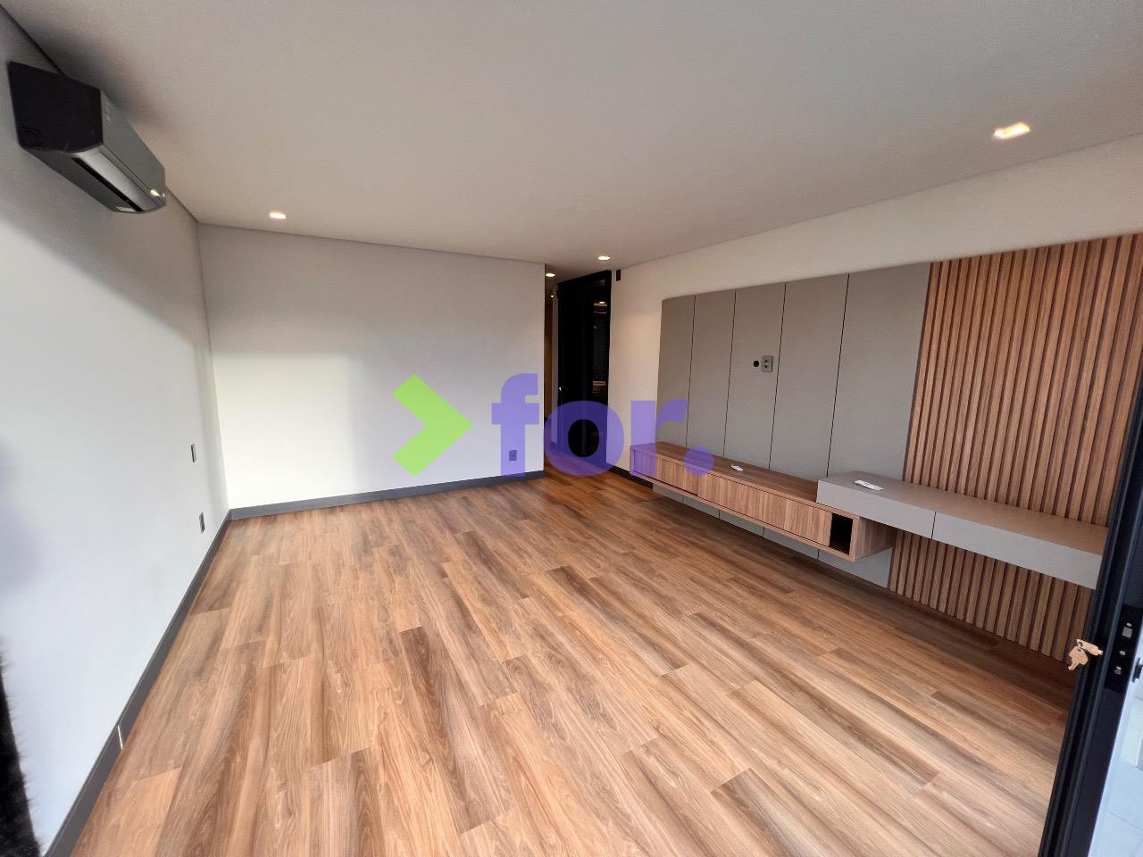 Quatro suítes, todas com closet e ar-condicionado. Rouparia no hall íntimo.