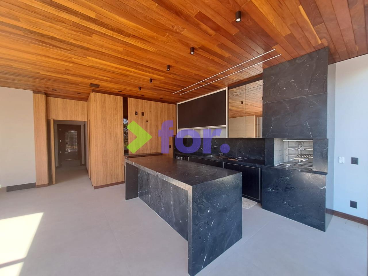 Sala integrada com cozinha e espaço gourmet. Piscina aquecida com tratamento por ozônio e espelho d’água.